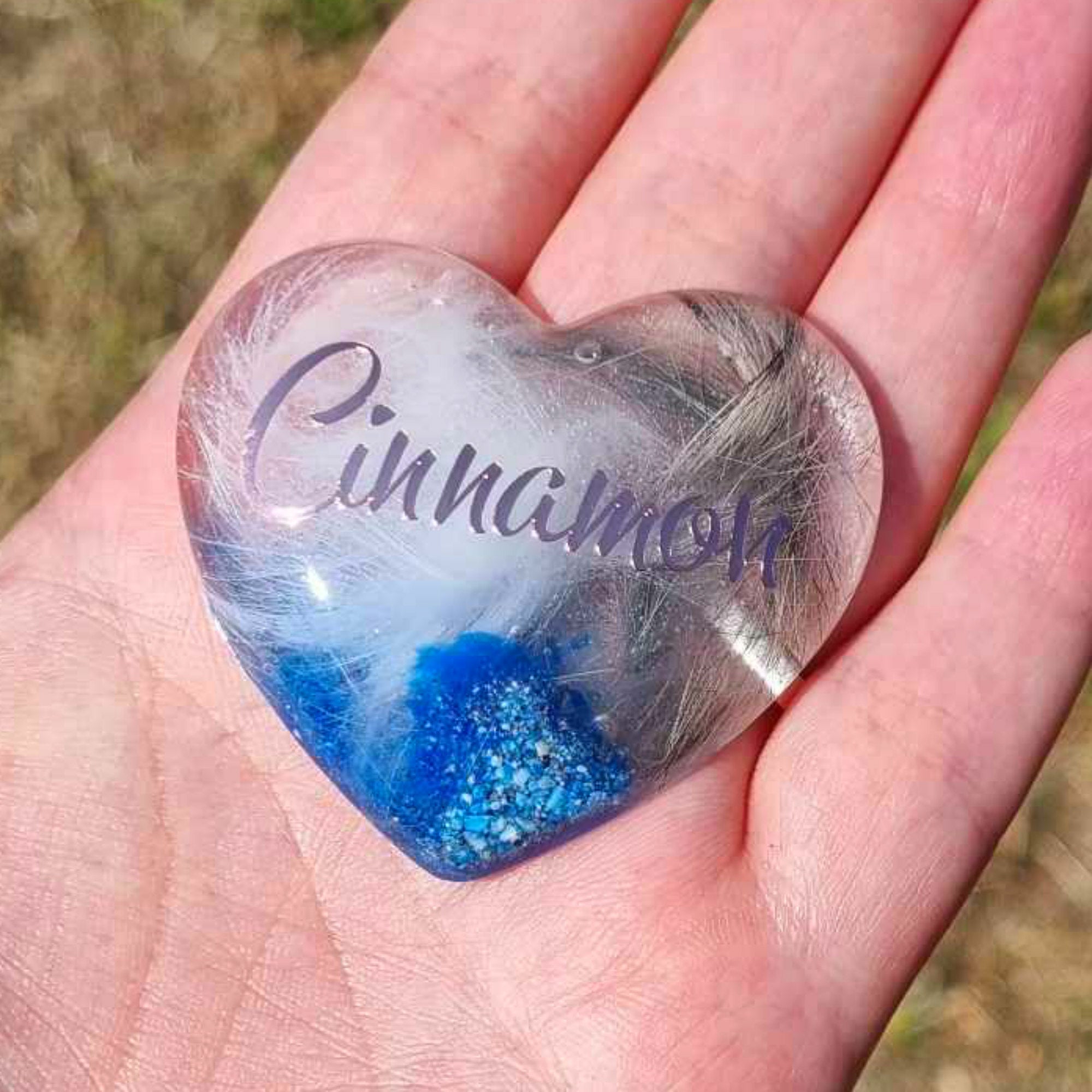 This 5cm smooth resin heart keepsake is made incorporating shimmering mica powder and pigments in a choice of colours, cremation ash AND fur provided by the customer. Please make your colour choice on check out.