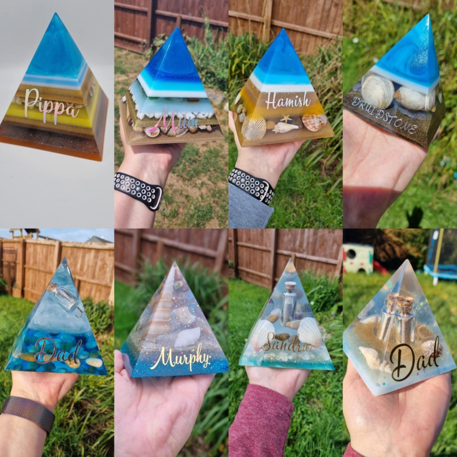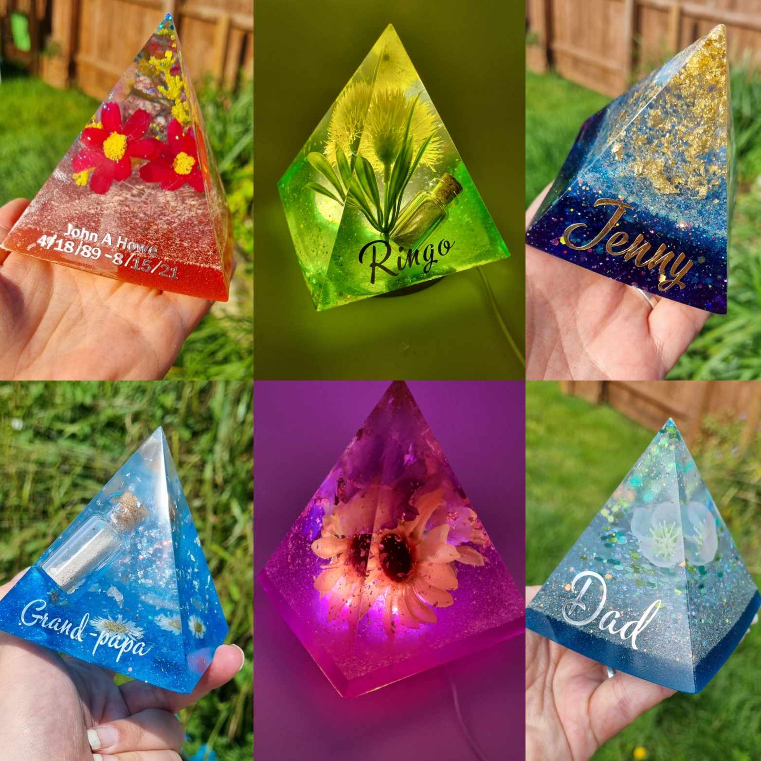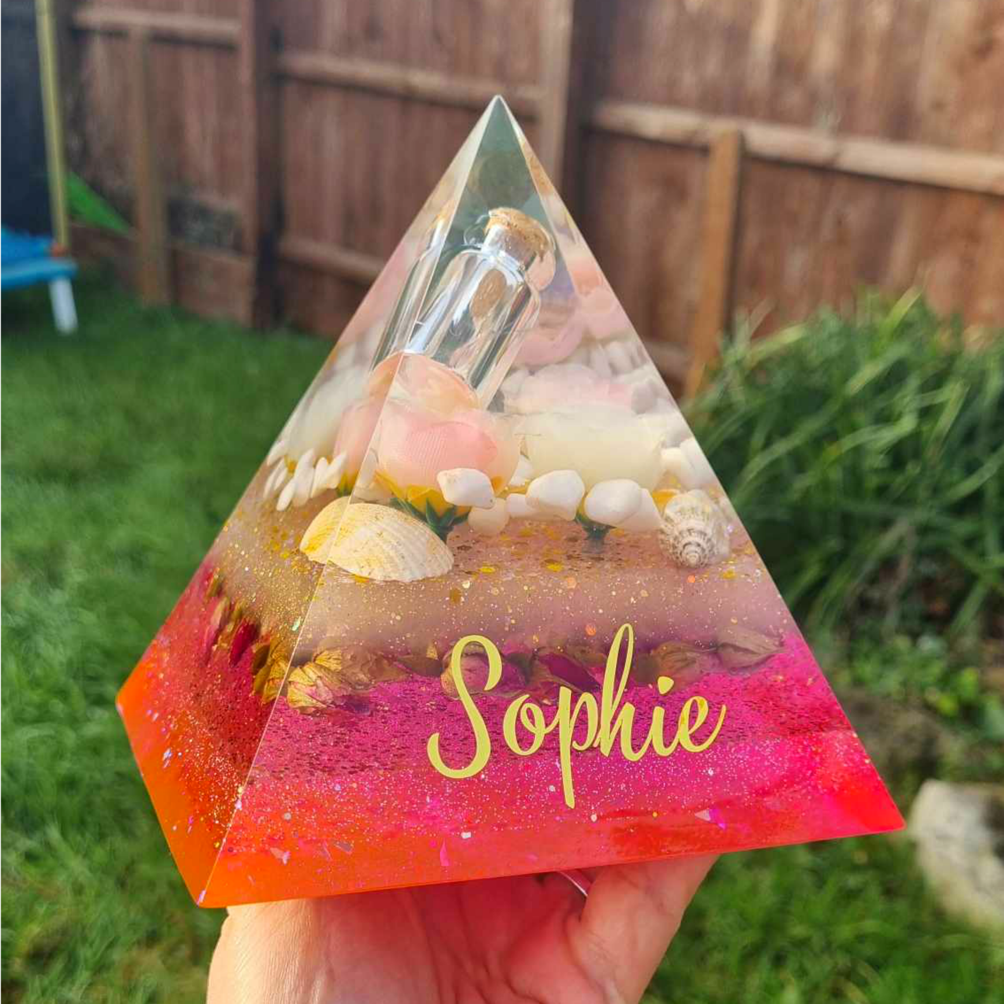 Large 15cm custom made memorial pyramid incorporating ashes and a choice of rose petals, metallic leaf, mica powders etc. Please contact me to discuss custom design or ask any questions. Please be aware that as these are handmade custom items, each one will be unique in appearance. Sizes are approximate and will vary slightly. FREE lettering is optional (name only) and will be added in vinyl and sealed with varnish.